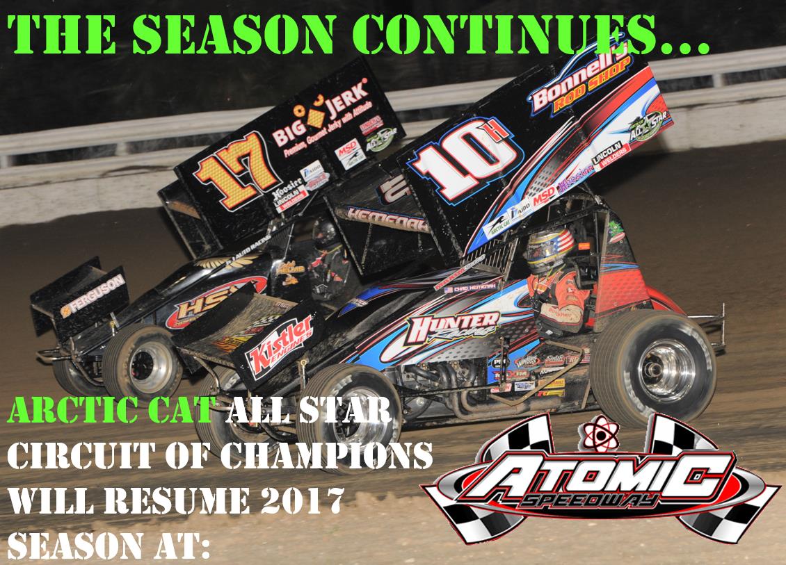 The Arctic Cat All Star Circuit of Champions made an Atomic Speedway appearance on two separate occasions in 2016, one of which during Ohio Sprint Speedweek presented by Cometic Gasket where Kyle Larson, the current Monster Energy NASCAR Cup Series point leader, was the victor. Sheldon Haudenschild, the current World of Outlaws Craftsman Sprint Car Series Rookie of the Year point leader, was the second winner at Atomic Speedway in 2016, earning the Arctic Cat All Star finale victory on October 22.