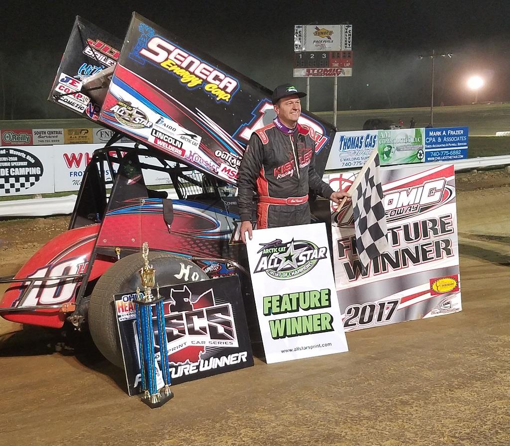 CHILLICOTHE, OH (April 9, 2017) - In dramatic fashion, Alvada, Ohio’s Chad Kemenah scored his first Arctic Cat All Star Circuit of Champions victory of the 2017 season on Sunday night in Chillicothe, Ohio, driving around race leader Lee Jacobs on the final circuit to score $5,000 at Atomic Speedway. The five-time and defending Arctic Cat All Star champion, who started sixth on the main event grid, used a late-race caution and a wide, slicked-off racing surface to help stage his dramatic finish.