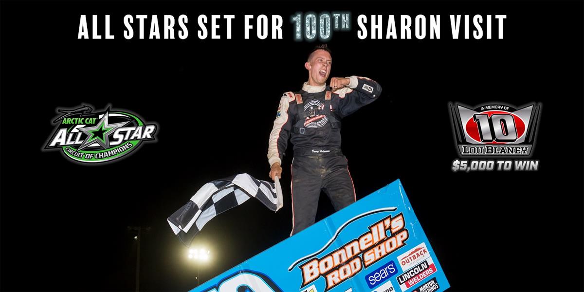 INDIANAPOLIS, IN (July 5, 2017) - For the 100th time in Series history, the Arctic Cat All Star Circuit of Champions will visit Sharon Speedway in Hartford, Ohio; the second of two Arctic Cat All Star appearances in 2017, this time honoring the late National Sprint Car Hall of Fame inductee, as well as the all-time leading Sharon Speedway Big Block Modified feature winner, Lou Blaney.