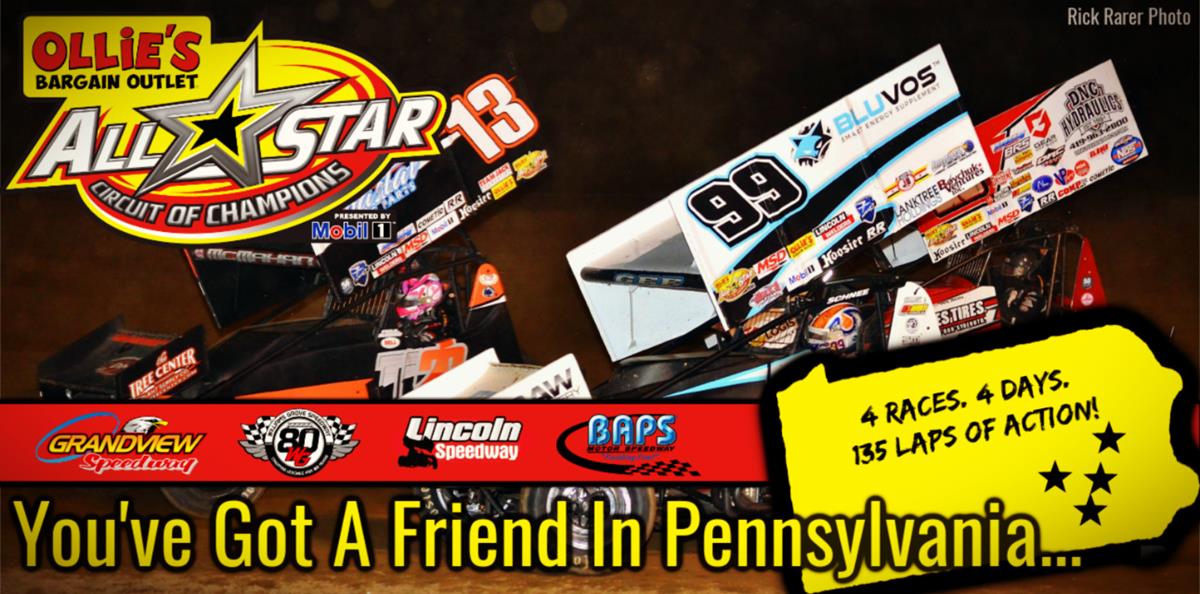 BROWNSBURG, Ind. (August 21, 2019) - Pennsylvania will be ‘home sweet home’ to Tony Stewart’s Ollie’s Bargain Outlet All Star Circuit of Champions presented by Mobil 1 during the coming weekend, set to invade Posse Country for four straight nights of competition beginning Thursday evening, August 22, at Grandview Speedway near Bechtelsville, Pennsylvania.