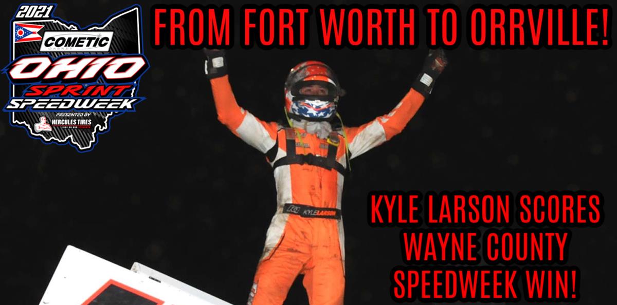 ORRVILLE, Ohio (June 14, 2021) - A mere-24 hours after earning the 2021 NASCAR All-Star Race victory at Texas Motor Speedway, “Yung Money” Kyle Larson was back behind the wheel of a sprint car, joining the FloRacing All Star Circuit of Champions presented by Mobil 1 for round three of the 39th running of Cometic Gasket Ohio Sprint Speedweek presented by Hercules Tires at Wayne County Speedway in Orrville, Ohio. The quick trip to “Orrville’s Historic Oval” proved victorious for the Elk Grove, California-native, capping the evening with an impressive rally from row five, working by second-year All Star and recent high school graduate, Zeb Wise, on lap 30 of 35 for the $6,000 payday.