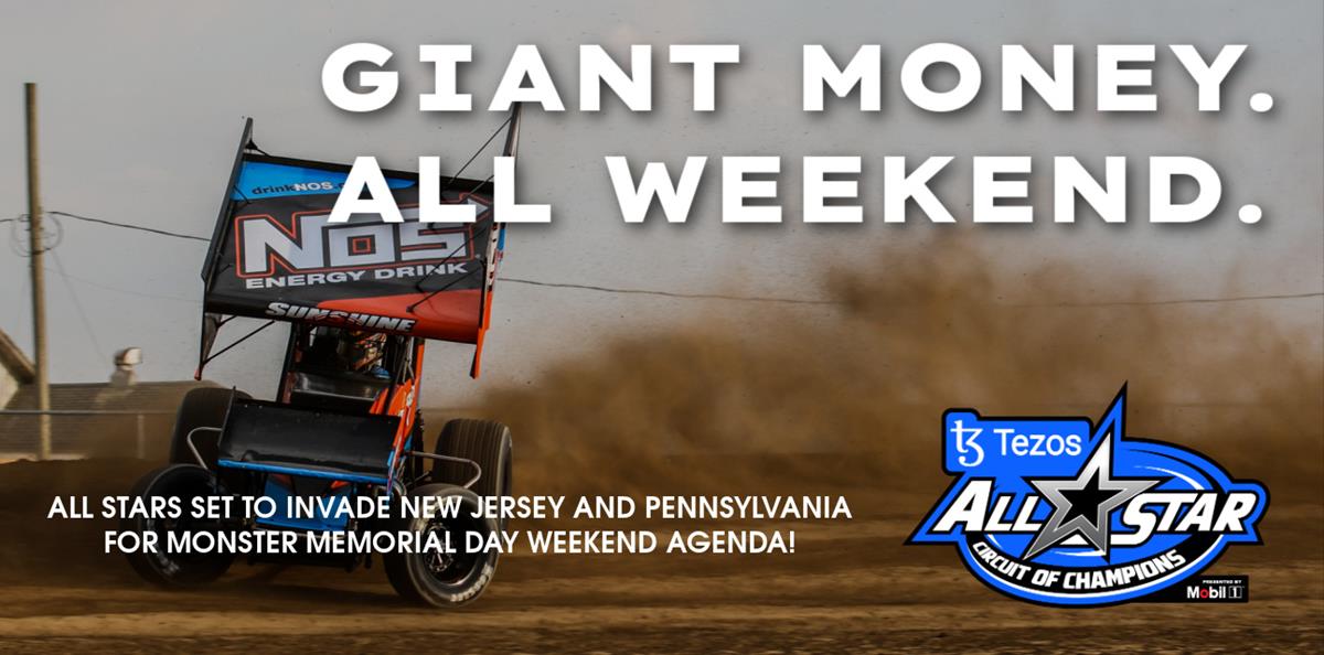 BROWNSBURG, Ind. (May 24, 2023) - Memorial Day weekend is set to be a monster for the Tezos All Star Circuit of Champions presented by Mobil 1, as the Series is ready to invade three tracks in four days for four separate events, all of which adding up to a $59,000 winning potential. If you break it down, all four programs will award a minimum of $10,000-to-win with the holiday headliner paying a whopping $29,000-to-win on Sunday, May 28. The action will commence officially tomorrow evening, Thursday, May 25, at Bridgeport Motorsports Park in Swedesboro, New Jersey; the first and only Garden State visit for the traveling All Stars in 2023.